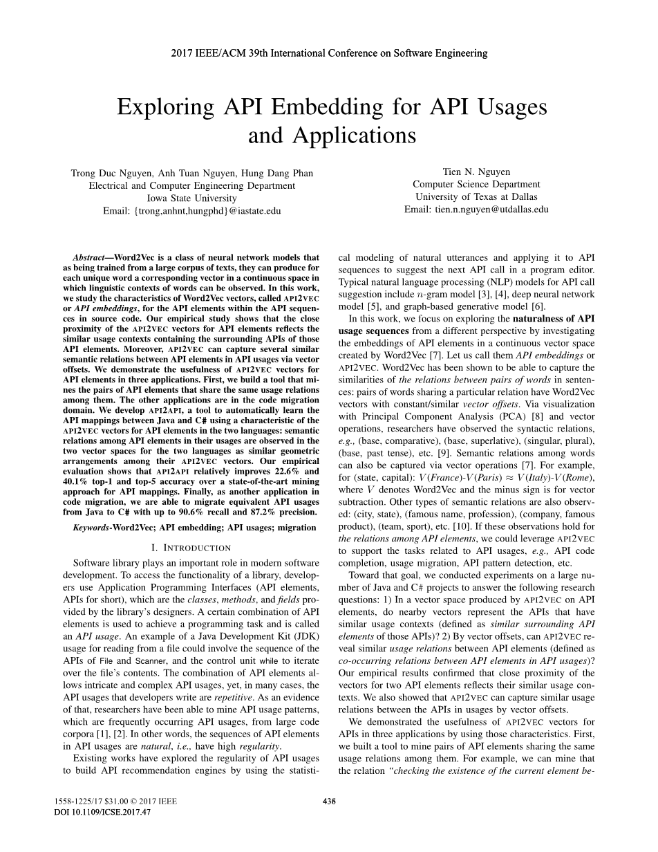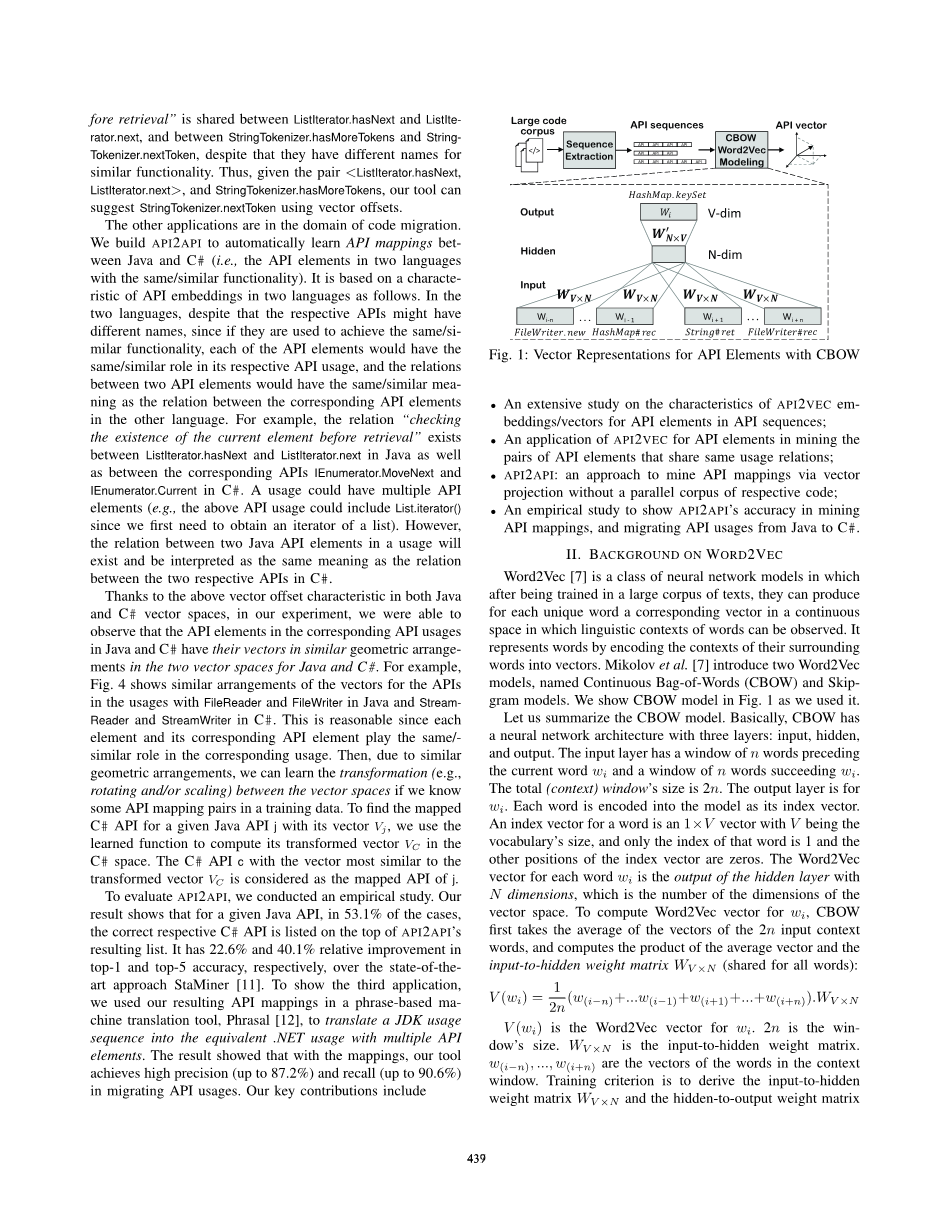 在这项工作中,我们通过研究由Word2Vec[7]创建的连续向量空间中API元素的嵌入,重点从不同的角度探索API使用序列的自然性。我们称它们为API嵌入或API2VEC。Word2Vec已被证明能够捕捉句子中词对之间关系的相似性:共享特定关系的词对具有恒定/相似向量偏移的Word2Vec向量。通过可视化的主成分分析(PCA)[8]和向量运算,研究人员观察了句法关系,如(基,比较),(基,最高级),(单数,复数),(基,过去式)等。词汇间的语义关系也可以通过向量运算[7]来获取。例如对于(国家, 首都): V (法国)-V (巴黎)asymp;V (意大利)-V (罗马),其中V表示Word2Vec,负号表示向量减法。其他类型的语义关系也被观察到:(城市,州),(著名的名字,职业),(公司,著名的产品),(团队,运动)等等[10]。如果这些观察结果适用于API元素之间的关系,我们可以利用API2VEC来支持与API使用相关的任务,例如API代码完成、使用迁移、API模式检测等。