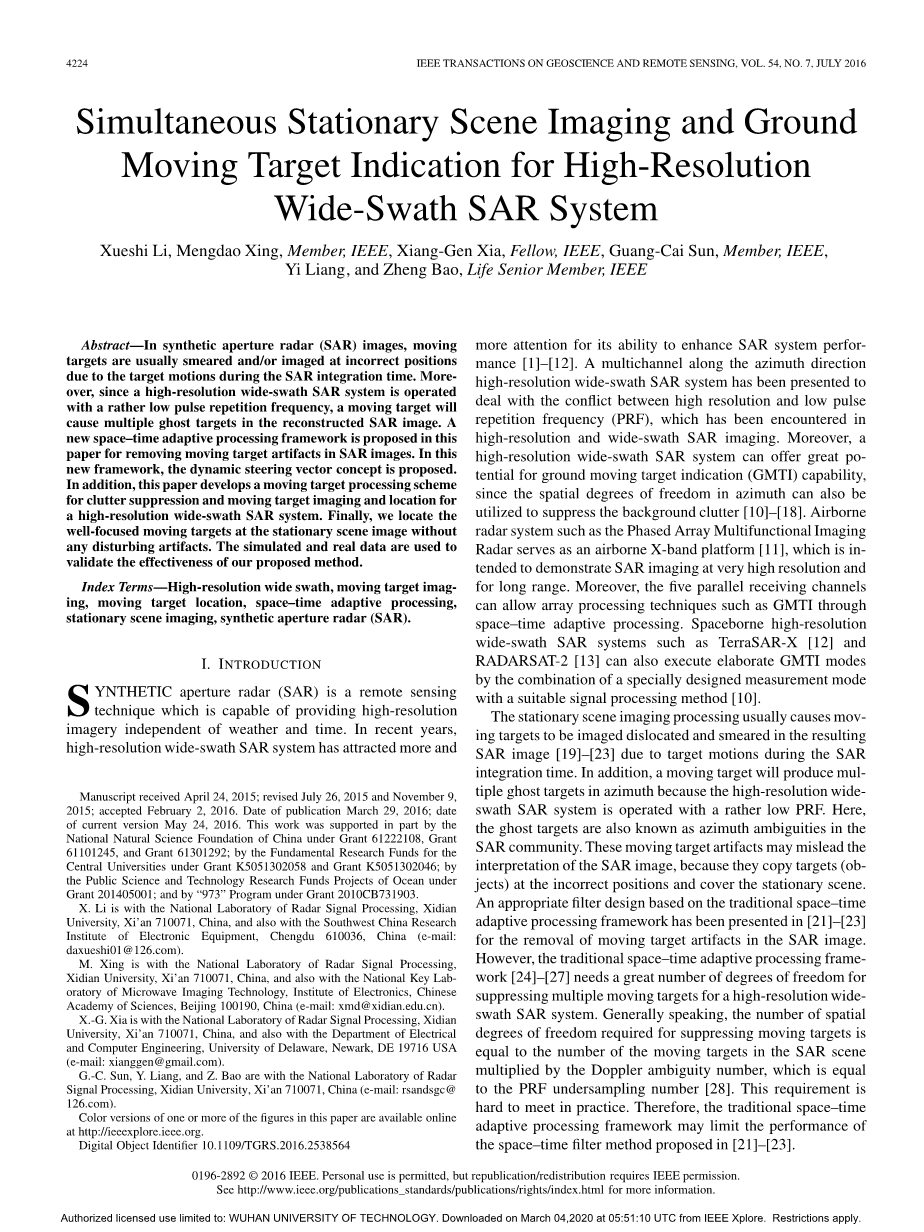 索引词——高分辨率宽幅,移动目标成像,移动目标定位,时空自适应处理,固定场景成像,合成孔径雷达(SAR)