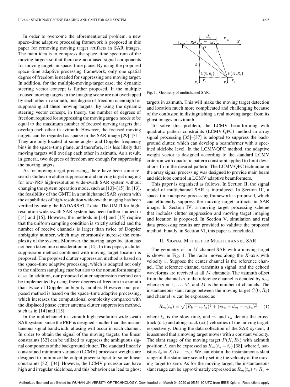 关于运动目标的处理,已经有一些对低PRF高分辨率宽波段SAR系统进行杂波抑制和运动目标成像的研究,如[13] – [15]。在[13]中,使用RADARSAT-2数据验证了GMTI在具有高分辨率宽幅成像能力的多通道SAR系统中的可行性。在[14]和[15]中对用于高分辨率宽波段SAR系统的GMTI进行了进一步研究。 然而,[14]和[15]中的方法要求严格满足统一的采样条件,并且接收通道的数量大于多普勒模糊度数量的两倍,这可能会极大地增加系统的复杂性。而且,在[14]中没有考虑移动目标位置。 提出了一种结合运动目标位置的杂波抑制方法。所提出的杂波抑制方法基于时空自适应处理,不仅适用于均匀采样情况,还适用于非均匀采样情况。另外,我们提出的杂波抑制方法可以通过使用比第二个多普勒模糊度数小的方位角自由度来实现。但是,我们提出的方法是基于空时自适应处理的,与[14]和[15]中的相移中心天线杂波抑制方法相比,它增加了计算复杂度。
