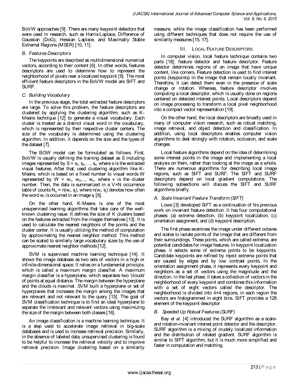 BoVW模型的第一步是检测局部兴趣点。对于兴趣点的特征提取,它们在预定义的位置计算,并缩放。在www.ijacsa.thesai.org 212中,特征提取是一个独立于特征表示的过程。在研究中使用了许多关键点检测器,如哈里斯-拉普拉斯、高斯差分(DoG)、黑森拉普拉斯和最大稳定极值区域(MSER)。
