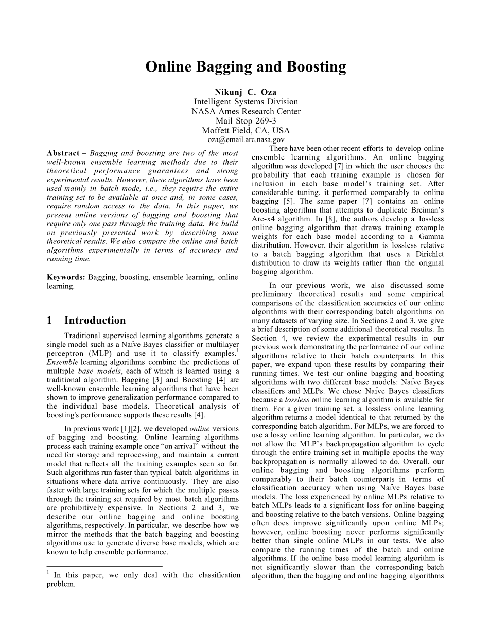在之前的工作中,我们还讨论了一些初步的理论结果,并对我们的在线算法与相应的批处理算法在许多不同大小的数据集上的分类精度进行了一些经验比较。在第2节和第3节中,我们简要描述了一些附加的理论结果。在第4节中,我们回顾了之前工作中的实验结果,这些结果展示了我们的在线算法相对于它们的批处理算法的性能。在本文中,我们通过比较它们的运行时间来扩展这些结果。我们使用两个不同的基本模型来测试我们的在线bagging和boosting算法:朴素贝叶斯分类器和mlp。我们选择朴素贝叶斯分类器,因为有一个无损的在线学习算法。对于给定的训练集,无损在线学习算法返回的模型与相应的批处理算法返回的模型相同。对于mlp,我们被迫使用有损的在线学习算法。特别是,我们不允许MLP的反向传播算法以通常允许的方式在多个时点内循环遍历整个训练集。总的来说,在使用朴素贝叶斯基模型时,我们的在线装袋和增强算法在分类精度方面与它们的批量同类算法有可比性。在线mlp相对于批处理mlp所经历的损失导致了在线bagging的显著损失和相对于批处理版本的增加。在线bagging往往大大改善在线mlp;然而,在我们的测试中,在线增强从来没有显著地优于单个在线mlp。我们还比较了批处理算法和在线算法的运行时间。如果在线基础模型学习算法没有明显慢于相应的批处理算法,那么bagging和在线bagging算法在我们的测试中,它们的运行时间没有太大的差异。另一方面,我们的在线增强算法运行速度明显快于批量增强。例如,在我们最大的数据集上,批处理助推的运行时间是在线助推的两倍,以实现可比较的分类精度。