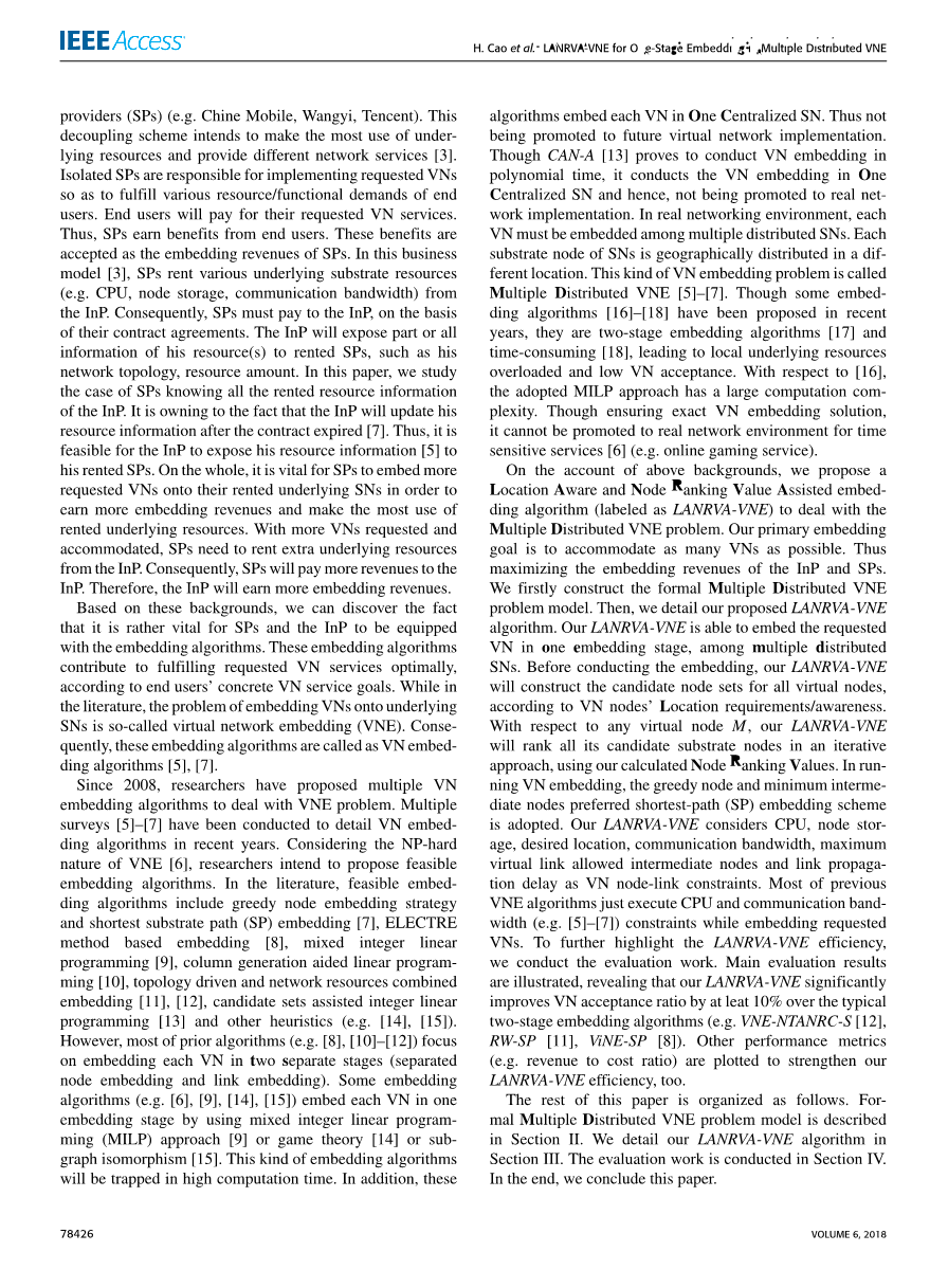 基于上述背景,我们提出了一个位置感知和节点排序值辅助的映射算法(简称LANRVA-VNE)以解决多样的分散的VNE问题。我们原始的映射目标是尽可能多的容纳虚拟网络,因而将InP和SP的映射收益最大化。我们首先建立了正式的多样化分布的VNE问题模型。然后,我们详细描述了提出的LANRVA-VNE算法。LANRVA-VNE能够在一个映射阶段内将虚拟网络请求映射到多样的分散的物理网络中。在执行映射前,LANRVA-VNE将根据虚拟网络节点的位置请求或识别,为所有虚拟节点建立候选节点集。对于任一虚拟节点M,LANRVA-VNE将利用我们的计算好的节点排序值,使用迭代算法对所有候选的物理节点排序。在运行虚拟网络映射时,运用贪婪节点和最小中间节点优先的最短路径映射方法。LANRVA-VNE考虑了CPU、节点存储、预定位置、通信带宽、最大化虚拟链路允许中间节点和链路延迟作为虚拟网络节点-链路的约束。大多数以前的VNE算法在映射虚拟网络请求时仅仅将CPU和通信带宽作为约束。为了进一步突出LANRVA-VNE的效率,我们进行了评估工作。主要的评估结果以图显示,展示了LANRVA-VNE算法将虚拟网络接受率在典型的两阶段映射算法(如VNE-NTANRC-S、RW-SP、ViNE-SP)上显著提高了至少10%。其他性能指标(如收入成本比)也被绘制出来以加强LANRVA-VNE算法的效率。