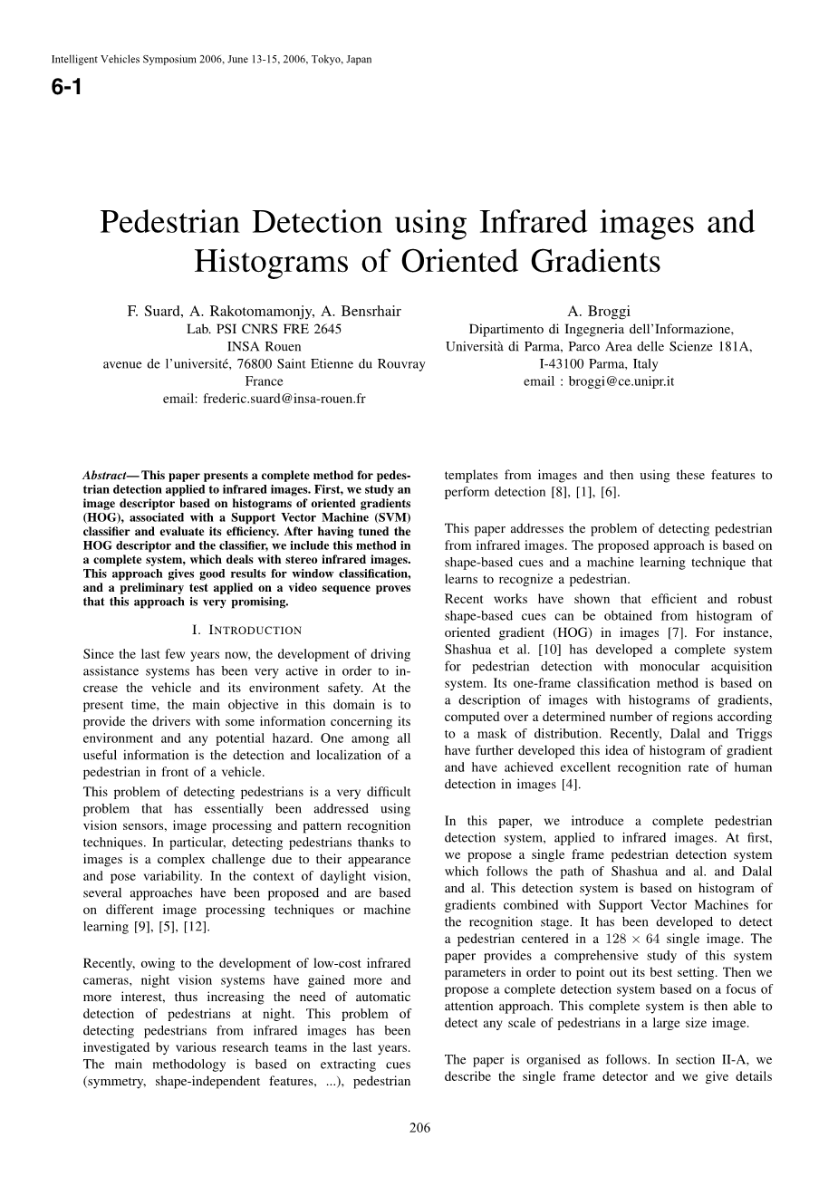本文介绍了一个完整的行人检测系统,应用于红外图像。首先,我们提出了一种遵循Shashua、Dalal 等人路径的单帧行人检测系统。该检测系统基于梯度直方图,结合支持向量机进行识别阶段。它已被开发用于检测以128times;64单个图像为中心的行人。本文对该系统参数进行了全面的研究,以指出其最佳设置。然后提出了一种基于注意力焦点方法的完整检测系统。这样,完整的系统就可以在大尺寸图像中检测任何规模的行人。