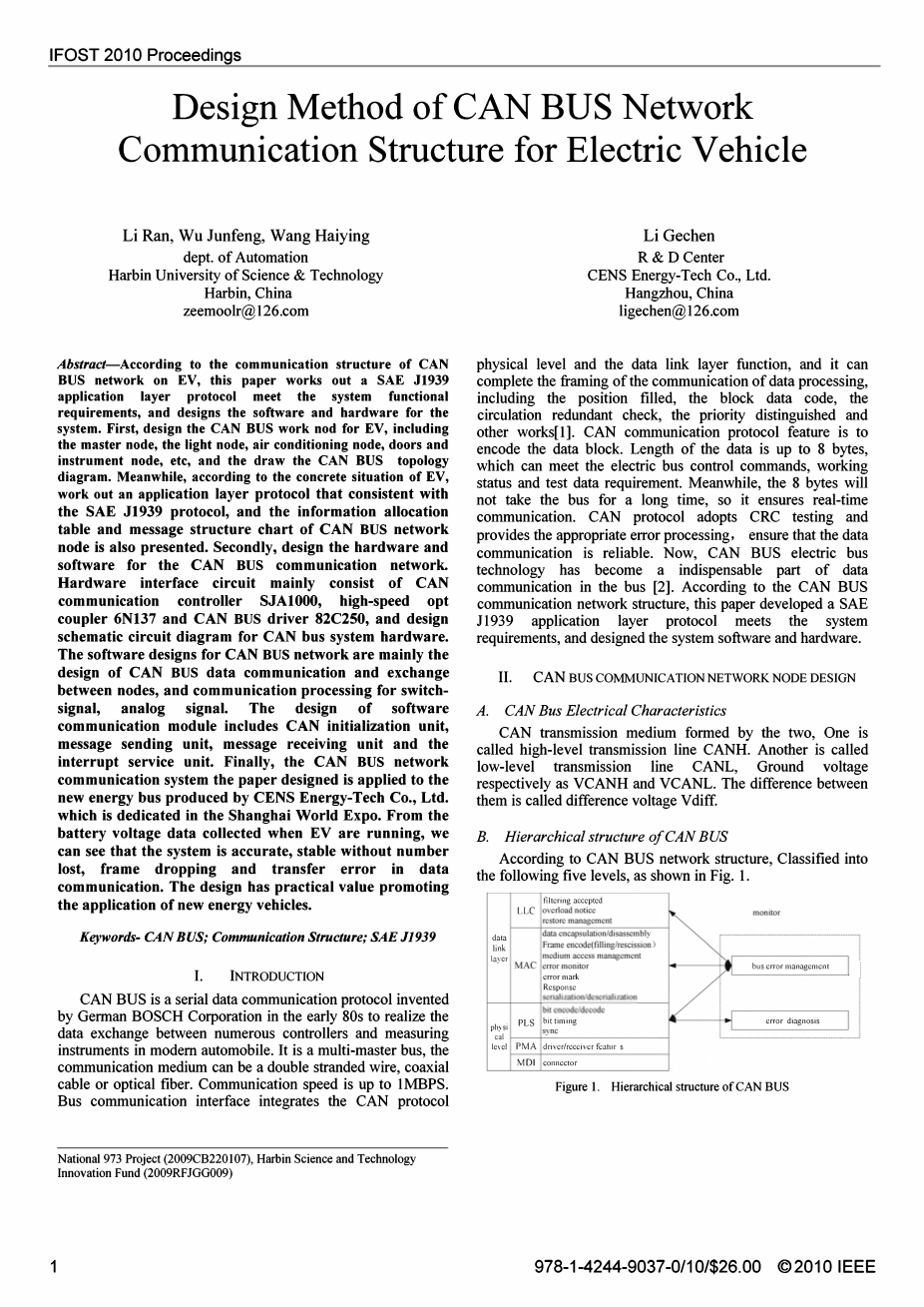关键词:CAN总线;通信结构;SAE J1939 ; 电动公交客车