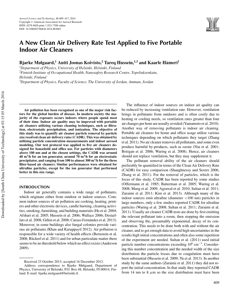 本文引用:Bjarke Moslash;lgaard , Antti Joonas Koivisto , Tareq Hussein amp; Kaarle Hauml;meri(2014) A New Clean Air Delivery Rate Test Applied to Five Portable Indoor Air Cleaners, Aerosol Science and Technology, 48:4, 409-417, DOI: 10.1080/02786826.2014.883063