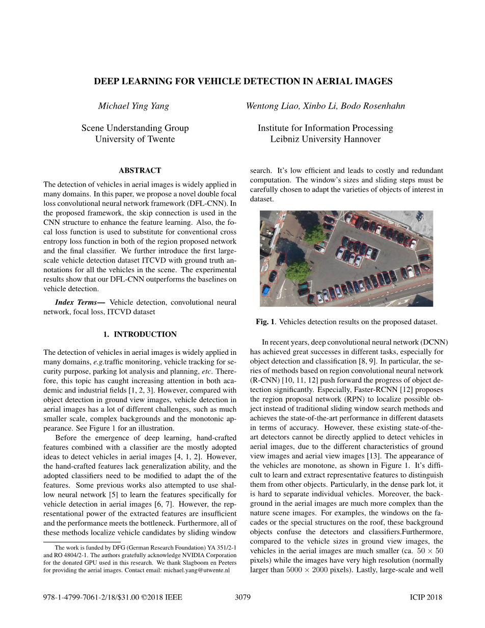 为了解决这些问题,我们提出了一个用于航空图像中车辆检测的特定框架,如图2所示。该新型框架称为双焦点损失卷积神经网络(DFL-CNN),它由三个主要部分组成:1)A添加从低层到高层的跳过连接以学习包含丰富详细信息的特征。2)RPN采用焦点丢失函数[16]代替传统的交叉熵。当RPN确定提案是否可能是感兴趣的对象时,该修改旨在解决类不平衡问题。3)焦点损失函数替换分类器中的交叉熵。它用于处理容易积极的例子和培训期间的硬性负面例子的问题。此外,我们还引入了一种新的大规模且注释良好的数据集,用于定量车辆检测评估 - ITCVD。为实现这一目标,我们收集了包含29088辆车的173张图像,其中ITCVD数据集中的每辆车都使用边界框手动注释。关于现有技术的基线,证明了所提出方法的性能。我们使我们的代码和数据集在线可用。