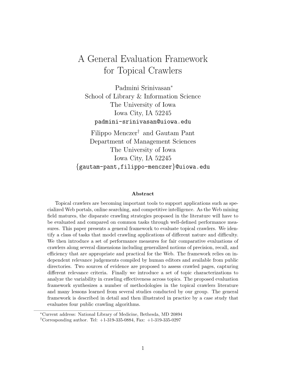 我们对爬虫文献[1,2,4,6,8,11,10,17,18,29,37]和我们自己的经验[21,24,25,26,22,31,32,27]的分析表明,表明通常,在开始比较爬行算法的实验时,会做出几个关键决策。这些不仅影响研究的直接结果和价值,还影响与未来爬虫评估进行比较的能力。在本文中,我们提供了基于这些决策的爬虫评估研究的一般框架。我们的目标是展示这个框架,并展示它在评估四个“现成”爬行器时的应用。我们的通用框架有三个不同的维度。第一个方面是关于爬行任务的性质(第2节)。这包括考虑如何确定主题以及如何识别种子和目标相关页面。第二个维度处理有效性和效率分析的评估指标(第3节)。框架的最后一个维度通过检查流行度和权威性及其对爬虫行为的影响等特定特征来更详细地研究主题(第4节)。我们将这个框架作为一种手段,通过实验系统地增加我们对履带式技术的理解。在这些部分之后,我们采用四个“现成”爬行器,并使用此框架对其进行比较(第5节)。我们在第6节中总结了我们案例研究中的实验和总体评估框架的讨论。