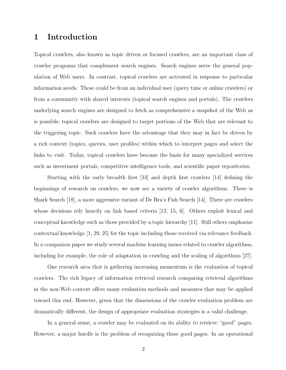 从早期的广度[33]和深入的第一个爬虫[14]开始,定义了爬虫研究的开始,现在我们看到了各种爬虫算法。 还有Shark Search [18],这是De Bra的Fish Search [14]更具侵略性的变体。 有些爬行者的决定很大程度上依赖于基于链接的标准[12,15,6]。 其他人则利用词汇层次结构提供的词汇和概念知识[11]。 还有一些人强调关于包括通过相关反馈收到的主题的情境知识[1,29,25]。 在一篇配套文章中,我们研究了与爬虫算法有关的几个机器学习问题,包括例如自适应在抓取中的作用和算法的缩放[27]。