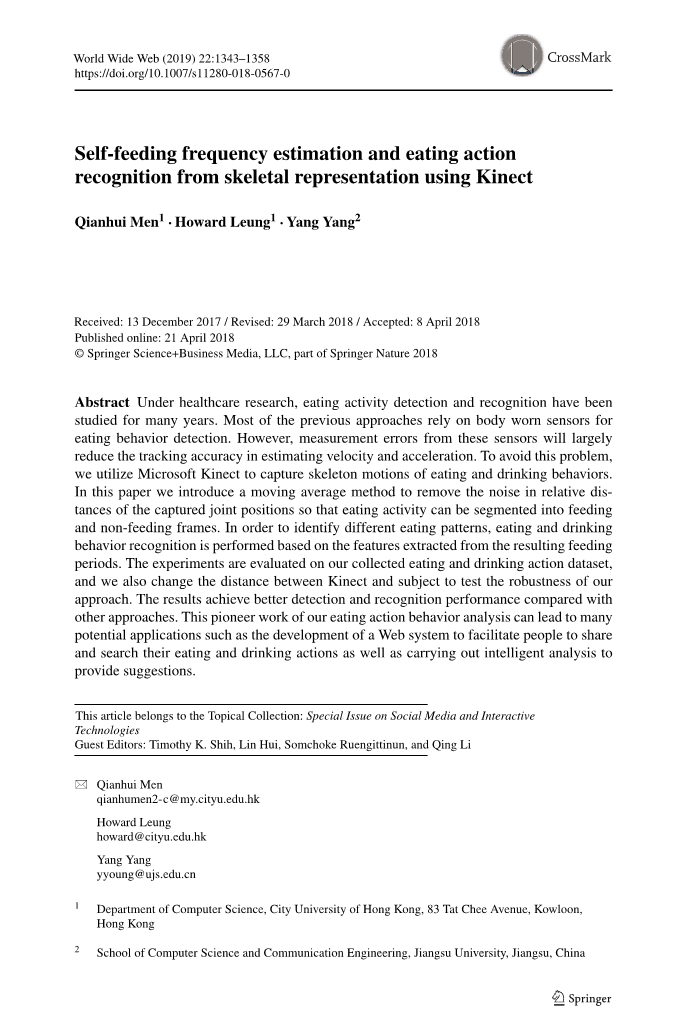 关键词 :骨骼运动;Microsoft Kinect;自我喂食检测;饮食行为识别