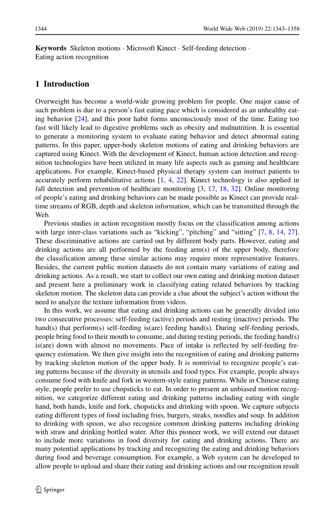 体重超重已成为世界范围内日益严重的问题。这类问题的一个主要原因是,一个人的快速进食行为被认为是一种不健康的饮食行为[24],而这种不良习惯在大多数情况下是无意识地形成的。吃得太快可能导致消化问题,如肥胖和营养不良。因此必须建立一个监测系统来评估饮食行为和检测异常饮食模式。本文利用Kinect捕捉了上半身的饮食行为的骨骼运动。随着Kinect的发展,人类行为检测和识别技术已被应用于游戏和医疗保健等许多生活领域。例如,基于Kinect的物理治疗系统可以指导患者准确地执行康复行动[1,4,22]。Kinect技术也应用于秋季检测和预防保健监测[3、17、18、32]。Kinect可以提供实时的RGB流、深度和骨骼信息,通过网络传输,可以对人们的饮食行为进行在线监控。
