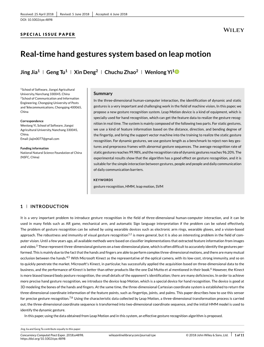 在三维人机交互领域引入手势识别是一个非常重要的问题,如果能有效地解决这一问题,它可以应用于AR游戏、机械手臂、自动手势语言解释等许多领域。手势识别问题可以通过使用可穿戴设备(如电子臂环、可穿戴手套和基于视觉的方法)来解决。视觉手势识别的鲁棒性和抗扰性更为普遍,但它也是计算机视觉领域的一个有趣问题。直到几年前,所有可用的方法都是通过从图像和视频中提取特征信息来实现分类。这些表示二维平面上的三维手势。这是由于手和手指可以进行复杂的三维运动,手与手指之间存在许多相互遮挡的现象。以Microsoft Kinect作为光学相机的代表,具有成本低、免疫性强等特点,可以快速穿透。市场。特别是微软的Kinect,已经成功地将基于三维数据的采集应用到了业务中,Kinect的性能比他们书中提到的其他产品都要好。然而,Kinect更偏向于身体姿势认知,即对手识别的小细节。智能化;存在许多不足,为了实现更精确的手势识别,我们介绍了一种特殊的手势识别装置——跳跃运动。该装置擅长对手、手指骨骼进行三维建模,同时建立三维笛卡尔坐标系,返回指尖、关节、手掌等特征点的三维坐标信息。本文介绍了如何利用该传感器进行精确的手势识别。利用跳跃运动采集的特征数据,进行了三维变换过程;将三维坐标序列转换为二维坐标序列,并利用初始的HMM模型识别动态。IC手势。