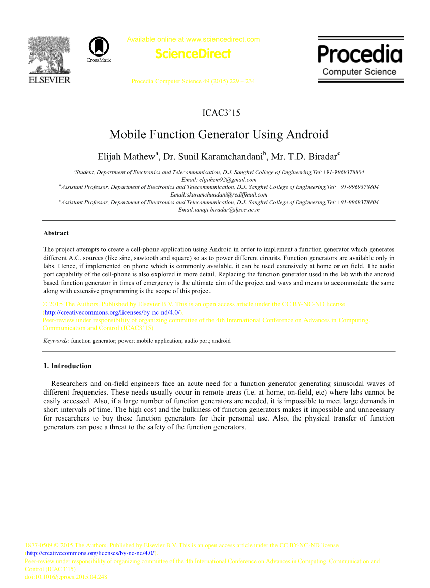 (6) 2015年作者。Elsevier b. v. 出版这是 CBY NC-ND 许可证下的公开访问文章(http://creativecommons.org/licenses/by-nc-nd/4.0}.第四届国际计算机进步会议组委会负责同行审查,通信和控制 (ICAC3 #39; 15)