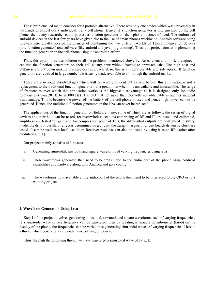 实验室。因此, 如果这个可以在通常可用的电话上实现, 那么它就可以在家里或现场广泛使用。并对手机的音频端口能力进行了更详细的探讨。将实验室中使用的函数发生器替换为在紧急情况下基于android函数生成器是项目的最终目标, 适应相同的功能与广泛的编程也是这个项目的范围。