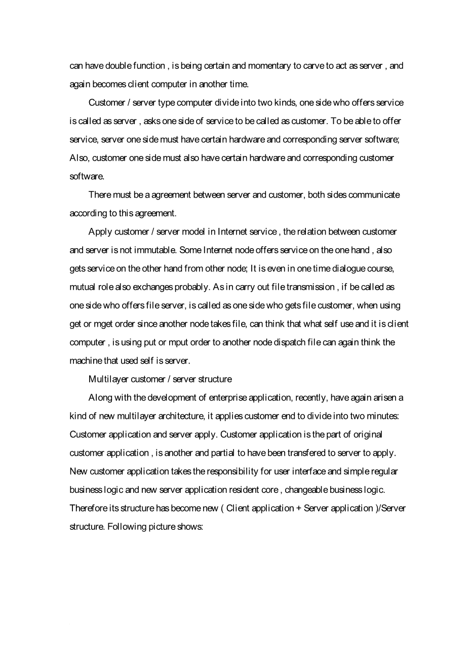 随着企业应用的扩展,最近又出现了一种新的多层体系结构,它把客户端应用分为两部分:客户应用和服务器应用。客户应用是原来客户应用的一部分,另一部分被移入服务器应用中。新的客户应用负责用户界面和简单固定的业务逻辑,新的服务器应用驻留核心的、易变的业务逻辑。因此其结构就变成了新的(Client应用 Server应用)/Server结构。如下图所示:
