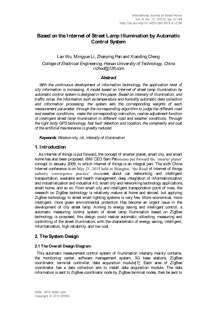 摘要:随着信息技术的不断发展,城市信息的应用水平也日益提高。本文设计了一种基于互联网路灯照明自动控制系统的模型。基于光照强度、交通噪声,还有温度、湿度等信息自动进行数据采集和信息处理,系统对每个测试变量设置了相应权重,通过相应的算法判断不同的道路和天气情况,并做出相应指令,实现在不同的道路和天气情况下智能路灯的光照调节功能。通过光体GPS技术,快速故障检测和定位,大大降低了人工维修的复杂度和成本。