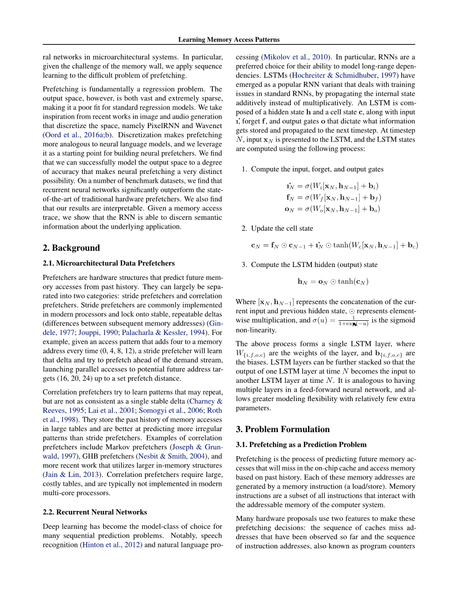 预取基本上是一个回归问题。然而,输出空间很大,而且非常稀疏,这使得它不适合于标准的回归模型。我们从最近关于图像和音频生成的离散空间的工作中得到了启发,即PixelRNN和WaveNET。离散化使预取更类似于神经语言模型,我们利用它作为构建神经预取程序的起点。我们发现,我们可以成功地将输出空间建模到一定的精度,这使得神经预取成为一种非常明显的可能性。在许多基准数据集上,我们发现递归神经网络的性能明显优于传统的硬件预取器。我们还发现我们的结果是可以解释的。在给定内存访问跟踪的情况下,我们证明了RNN能够识别底层应用程序的语义信息。