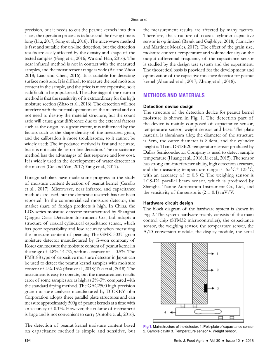 基于电容法检测花生仁含水量简单,灵敏,但是测量结果受到许多因素的影响。因此,优化了同轴圆柱电容传感器的结构(Basak和Gajbhiye,2018; Camacho Martinez Morales,2017)。通过设计测试系统和实验研究了颗粒尺寸,含水率,温度和体积密度对电容传感器输出差频的影响。为花生仁电容式水分检测器的开发和优化提供了理论依据(Ahamed等,2017; Zhang等, 2018)。