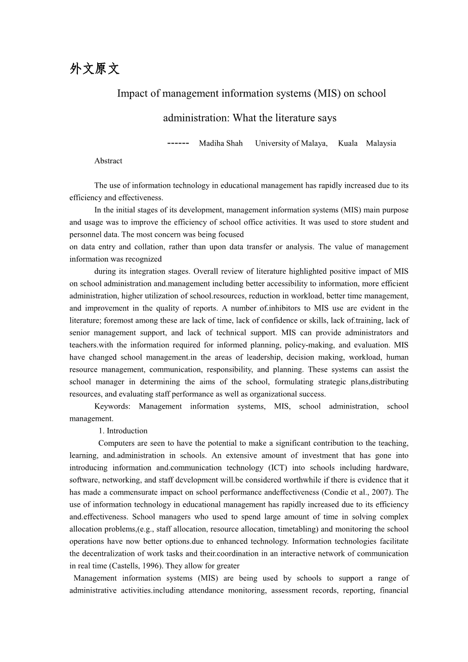 管理信息系统(MIS)正在使用由学校支持的一系列管理活动包括考勤监控、评估记录、报告、财务管理、资源和人员分配。管理信息系统为管理人员提供管理组织效率和所需的有效信息。这些系统有别于其他信息系统,因为它们被设计成用来分析和促进组织战略与经营活动。沃森描述了管理信息系统(MIS)是“一个组织提供的方法过去、现在和预测信息与内部业务和外部相关情报。它支持一个有组织的计划、控制和操作功能从而提供统一的信息在合适的时间框架来帮助决策者”。Telem(1999)定义了管理信息系统MIS的设计匹配的结构、管理任务,教学过程和特殊需要的学校”。brien(1999)称MIS为“一个学期的学科重点与目标和计算机系统的集成一个组织的目标”。基于上述定义,管理信息系统是指一个系统, 在运营中使用所需的信息组织各级的管理,战术和战略决策。它的主要目的是设计和实施程序、流程和系统,提供一个精确的合适的详细报告。管理信息系统在决策领域中起到了至关重要的作用,因为它可以监控系统本身的干扰,确定行动,采取行动去控制的系统。这也是在非程序有关的决定,因为它提供了支持通过提供信息搜索、分析、评估和选择和实施决策的过程。这些系统有能力提供其用户信息处理、分析模型、实时更新和协助他们的决定——假设的场景制作过程。本文将叙述的研究调查了在学校管理和管理信息系统的影响。其中的一些研究也强调了因素阻碍管理信息系统在学校的使用管理。