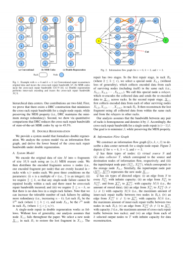 本文针对于分层数据中心提出了双重再生代码(DRC)。我们的贡献是双重的。首先,我们证明存在一种DRC结构,可以最小化单节点修复的跨机架修复带宽,同时保留MDS属性(即DRC保持最小的存储冗余)。其次,我们通过定量比较表明,DRC比最先进的MSR代码的跨机架修复带宽降低了45.5%。