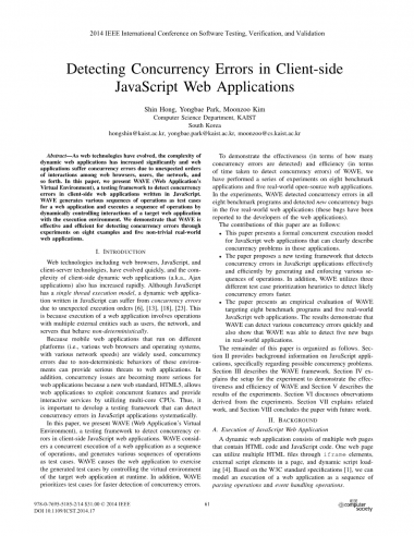 bull;本文介绍了针对八个基准程序和五个真实世界JavaScript Web应用程序的WAVE的实证评估。结果表明,WAVE可以快速检测各种并发错误,并且还表明WAVE能够在实际应用程序中检测到五个新的错误。