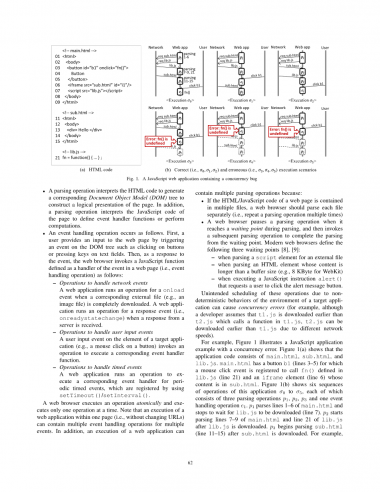 在示例中,sigma;3,sigma;4和sigma;5,其中e1在p2之前是错误执行,无法运行fn(),因为fn()尚未定义。 请注意,p1始终出现在p2,p3和e1之前,因为用户只有在p1创建b1后才能单击b1。 但是,p2,p3和e1之间的执行顺序取决于下载lib.js和sub.html的时间以及用户单击b1的时间。 例如,p2发生在p3之前,iflib.js在sub.html之前下载(即sigma;0,sigma;1和sigma;4),反之亦然,如果在lib.js之前下载sub.html(即sigma;2,sigma;3和sigma;5)。 正如我们在此示例中看到的,尽管Web浏览器一次只执行一个操作,但Web应用程序仍然可能遭受并发错误。