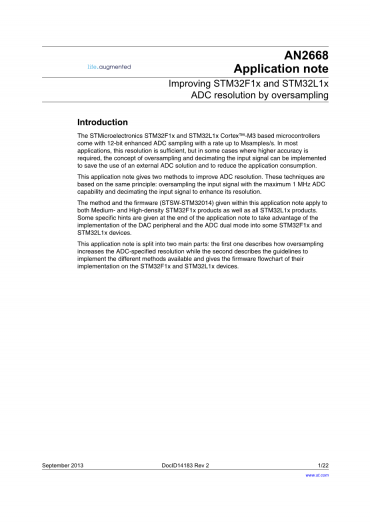 本应用说明分为两个主要部分:第一部分描述了ADC采样如何提高指定分辨率,第二部分描述了实现可用不同方法的指南,并给出了在STM32F1X和STM32L1X设备上实现这些方法的固件流程图。