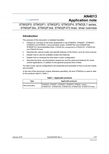 - 概述STM32F0,STM32F1,STM32F2,STM32F4和STM32L1微控制器系列,STM32F30x和STM32F3x8,STM32F37x微控制器系列中的定时器外设。STM32F30x对应STM32F301, STM32F302和STM32F303线路。