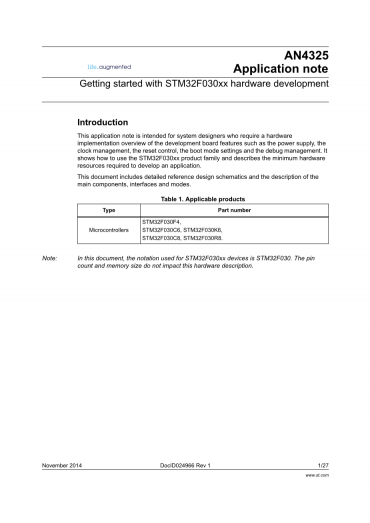 本应用笔记适用于需要开发板功能的硬件实现概述的系统设计人员,例如电源,时钟管理,复位控制,引导模式设置和调试管理。 它显示了如何使用STM32F030xx系列产品,并描述了开发应用程序所需的最低硬件资源。