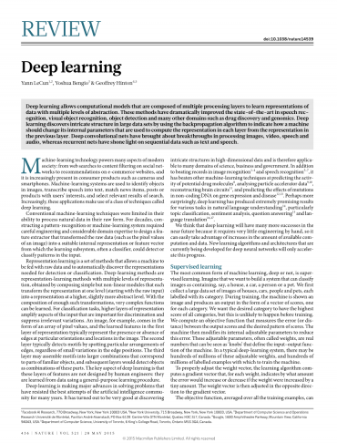 深度学习允许由多个处理层组成的计算模型来学习具有多个抽象级别的数据表示。这些方法极大地改进了语音识别,视觉对象识别,物体检测以及药物发现和基因组学等许多其他领域的最新技术。深度学习通过使用反向传播算法来指示机器应如何更改其内部参数(用于从前一层中的表示计算每个层中的表示)来发现大数据集中的复杂结构。深度卷积网络在处理图像,视频,语音和音频方面带来了突破,而循环网络则在文本和语音等顺序数据处理取得了突破。