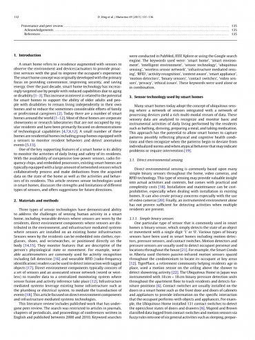 鞋子和手表,或直接放在身体[14,15]。它们监视人的生理状态或运动。例如,可穿戴加速度计通常用于活动识别包括跌倒检测[16]和可穿戴RFID读者可用于检测与标记的交互对象[17]。直接环境组件通常由一组传感器和相关的传感器网络(有线或无线)将数据传输到集中监控系统传感器融合和活动推断发生[12]。基础设施中介系统利用现有的家庭基础设施,如管道或电气系统,调解的转换事件[18]。本文主要关注直接环境组件和基础施中介系统技术。该文献综述包括已经发表的已发表的着作同行评审。搜索仅限期刊中的文章,期刊章节和会议记录英语并于2000年至2010年间出版。关键字搜索在PubMed,IEEE Xplore或使用谷歌搜索进行。使用的关键词是:#39;智能家居#39;,#39;智能环境#39;,#39;智能环境#39;,#39;传感器技术#39;,#39;无处不在传感#39;,#39;无线传感器网络#39;,#39;基础设施中介传感#39;,#39;RFID#39;,#39;活动识别#39;,#39;环境感知#39;,#39;智能家电#39;,#39;运动探测器#39;,#39;二进制传感器#39;,#39;接触开关#39;,#39;视频传感器#39;,#39;隐私#39;,#39;道德问题#39;。这些关键字单独使用或使用结合。