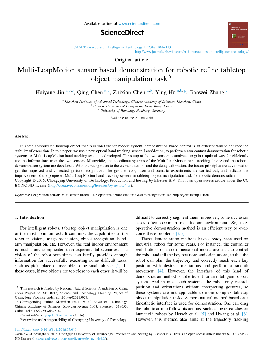 Keywords: LeapMotion sensor; Muti-sensor fusion; Tele-operative demonstration; Gesture recognition; Tabletop object manipulation