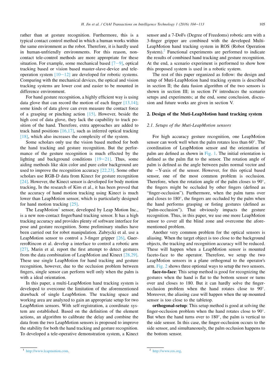 本文的其余部分组织如下: 第二节介绍了多 LeapMotion 手跟踪系统的设计和设置;第三节给出了两个传感器的数据融合算法;第四部分介绍了场景的设置和实验;最后, 在第五部分给出了一些结论、讨论和今后的工作。