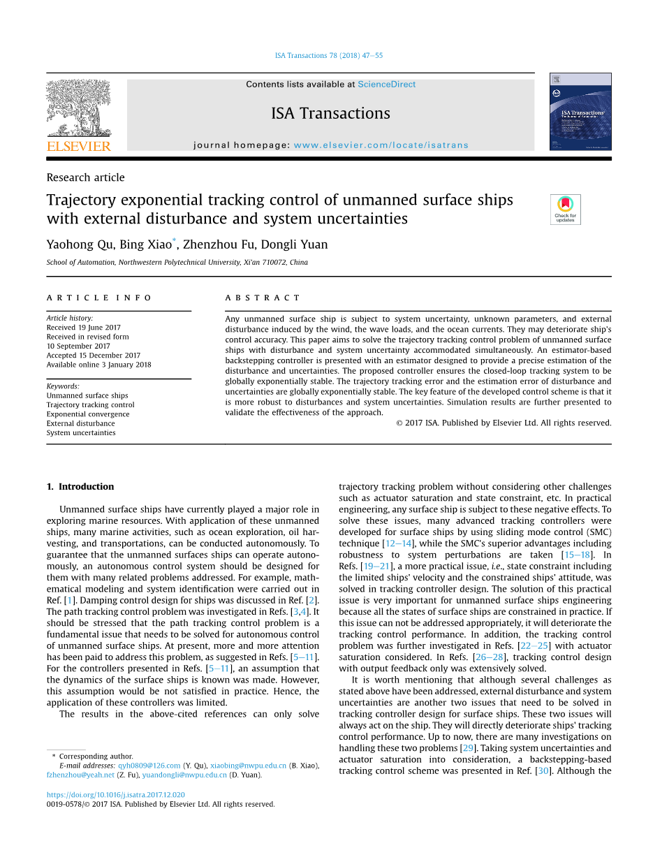 关键词:无人水面船;轨迹跟踪控制;指数收敛;系统不确定性