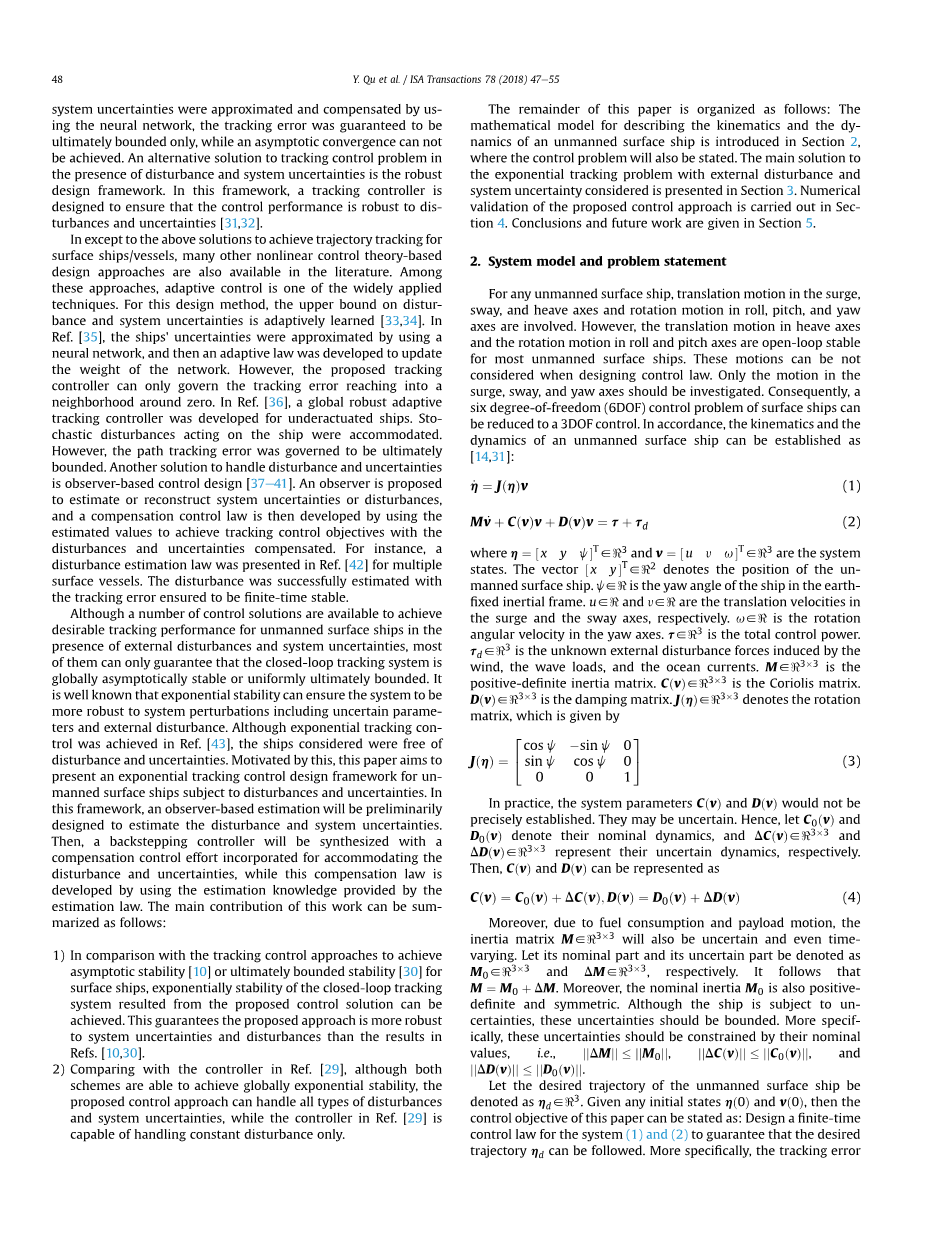 本文的其余部分组织如下:第2章介绍了描述无人水面船运动学和动力学的数学模型,并阐述了控制问题。第3章给出了考虑外部干扰和系统不确定性的指数跟踪问题的主要解。第4章对所提出的控制方法进行了数值验证。结论和未来的工作写于第5章。