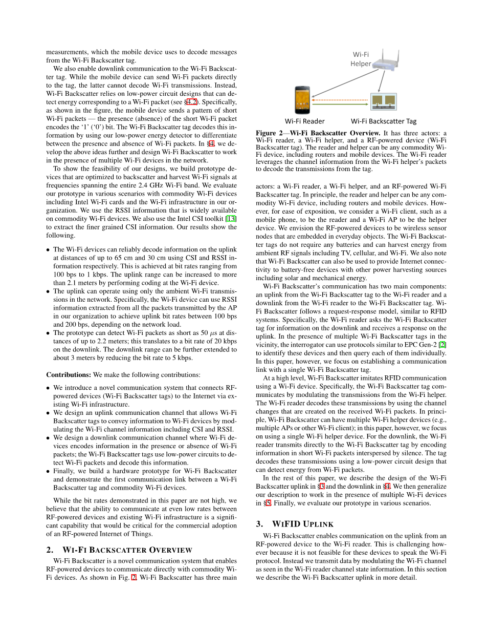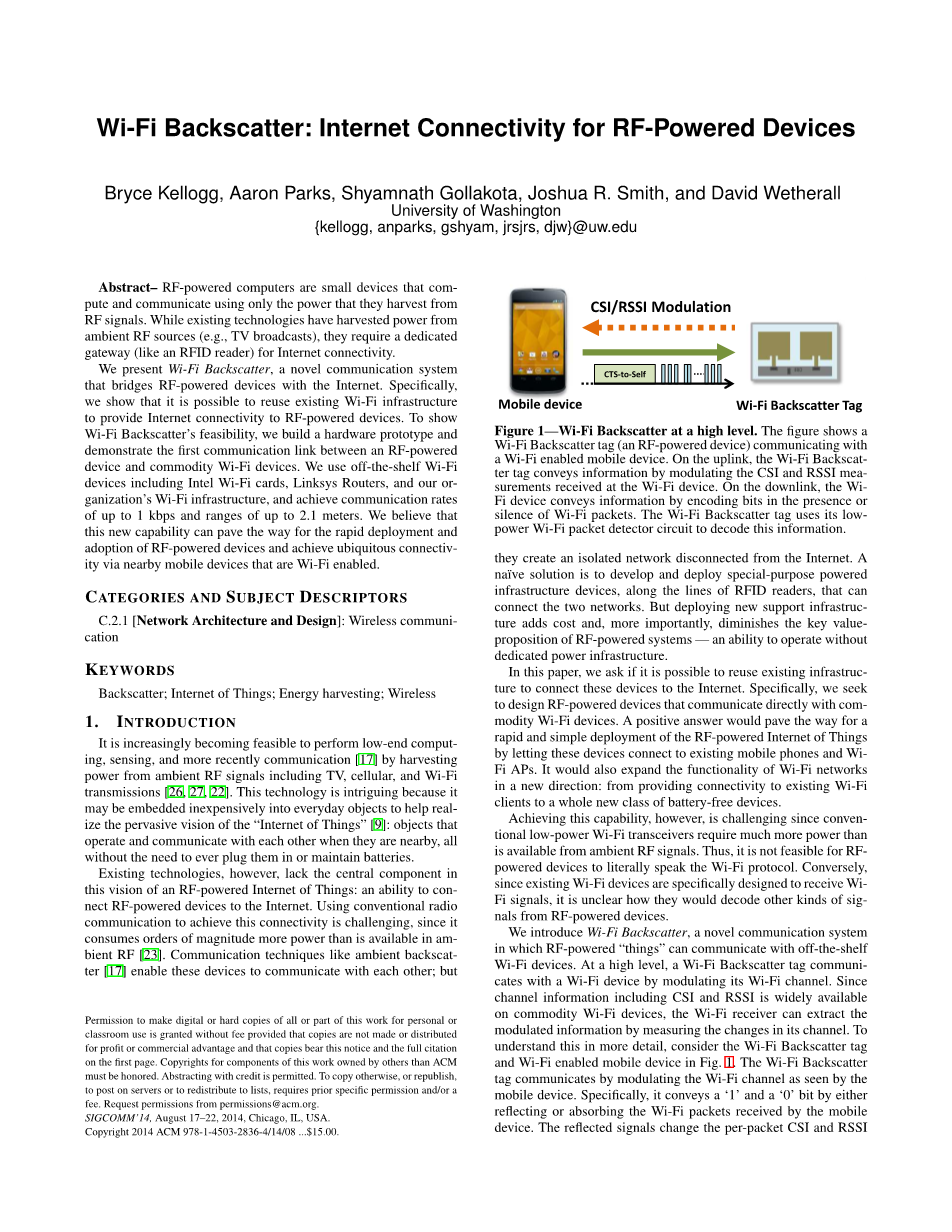 在本文中,我们探讨是否有可能重新利用现有的基础设施,将这些设备连接到互联网。特别的,我们力求设计可以与商用WIFI设备进行直接通信的射频装置。通过将这些装置与现有的移动电话和wifi APS相连接, 将会为简单快速的部署射频驱动的物联网铺平道路。它还将从一个新的方向扩大wifi网络的功能:将现有的wifi客户端和一个全新类别的无源设备连接起来。