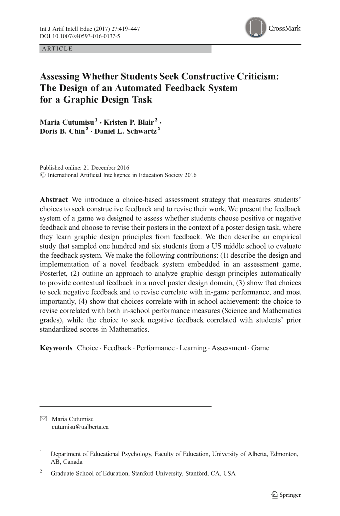 我们引入了一种基于选择的评估策略,选择寻求建设性的反馈和修改他们的工作。我们提出反馈意见我们设计了一个游戏系统来评估学生是选择正面还是负面反馈并选择在海报设计任务的背景下修改他们的海报他们从反馈中学习平面设计原则。然后我们描述一个经验这项研究抽取了一所美国中学的106名学生进行评估反馈系统。我们做出如下贡献:(1)描述设计和嵌入在评估游戏中的新颖反馈系统的实现,Posterlet(2)概述了一种自动分析图形设计原理的方法在新颖的海报设计领域提供情境反馈,(3)展示选择寻求负面反馈,并修改与游戏中的表现相关的内容,大多数情况下重要的是,(4)表明选择与校内成绩相关:选择修改与校内绩效测量(科学和数学成绩),而寻求负面反馈的选择与学生之前的相关数学中的标准化分数。