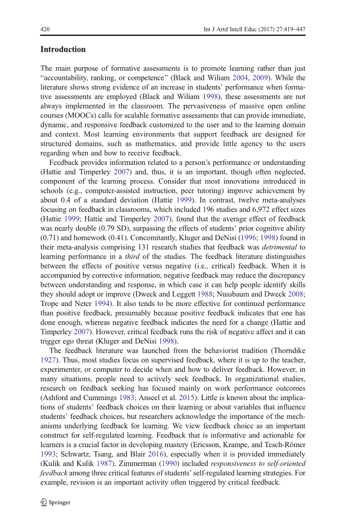 形成性评估的主要目的是促进学习而不仅仅是促进学习可计量性,排名或能力^(Black and Wiliam 2004,2009)。虽然文献显示了形成性时学生成绩提高的有力证据采用评估(Black和Wiliam 1998),但这些评估不是始终在课堂上实施。大规模开放在线的普遍性课程(MOOC)要求可扩展的形成性评估,可以提供即时,动态的,响应式的反馈,为用户和学习领域定制和上下文。大多数支持反馈的学习环境都是为了设计结构化的领域,如数学,并为用户提供很少的代理关于何时以及如何接收反馈。反馈提供与个人表现或理解相关的信息