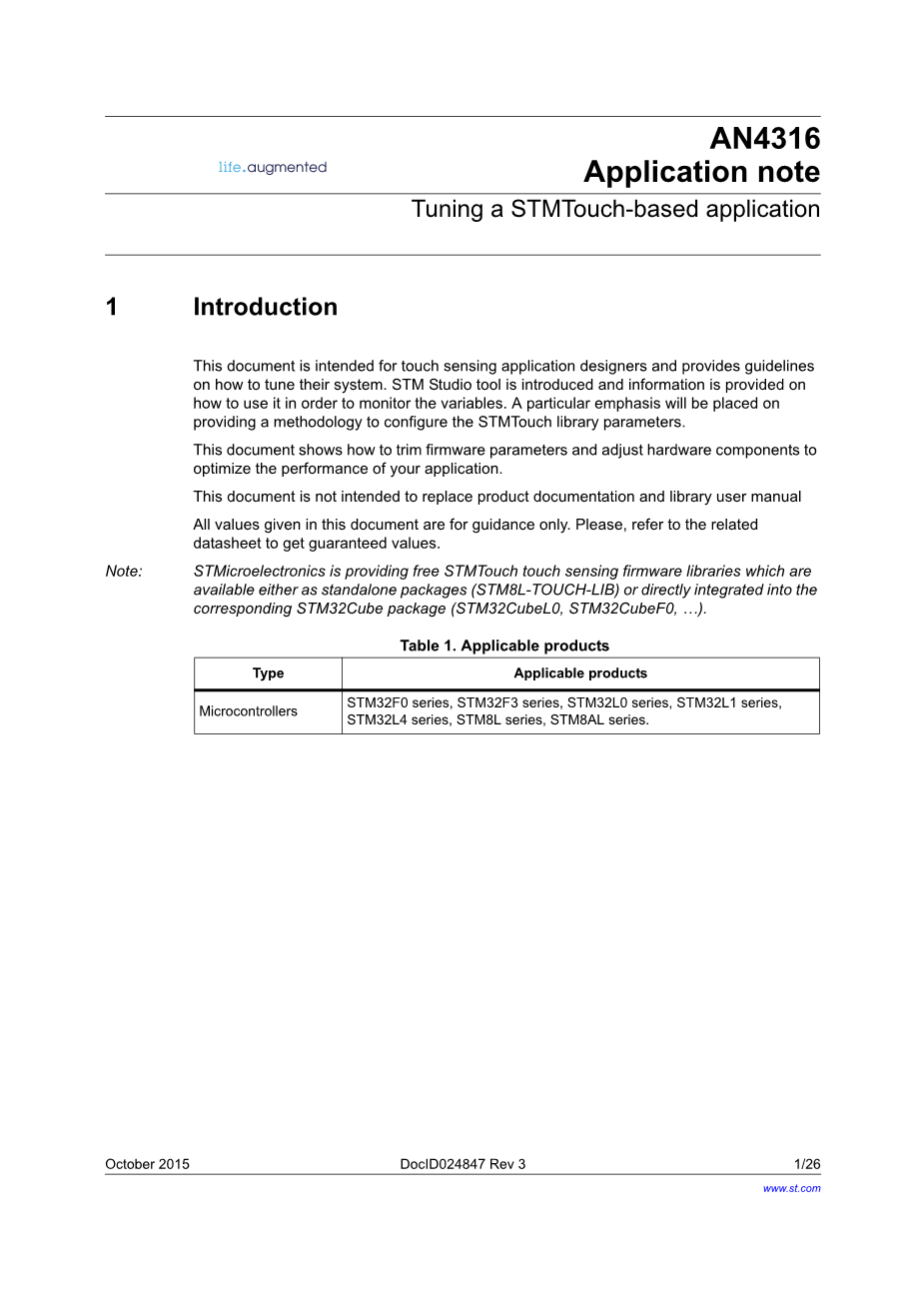 本文档旨在给予传感器应用程序设计人员指导他们如何调整系统。STM Studio提供了监控变量的工具,并特别提供一种方法来配置STMTouch库参数。