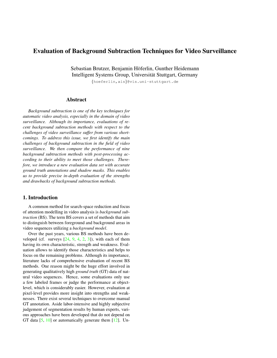 2004年,Cheung和Kamath [6]评估了在不同天气条件下城市交通视频中的6种BS方法的性能。在Karaman等人的工作中,[15],比较了9种BS方法(从1982年到2004年排列)的分割性能处理时间和内存占用等。在5个测试视频上手动标记GT数据,并在不同来源的干扰下进行评估。数据集包含不同光线的视频,其中一些是压缩视频,一些是未被压缩的。Parks和Fels [23]考虑了几种BS算法(仅其中一种使用了最先进的算法),用于前景验证和后期处理。对于评估,他们也使用了不同来源的视频(例如Wallflower数据集[27])。最近,Herrero和Besco提出了使用结合了广泛数据集的前景和背景对象对BS技术进行系统评估[13]。但是,这个数据集并不包含场景光线和阴影等问题。在评估中,他们考虑了室内/室外环境和动态背景。与之前的评估相比,我们还考虑到了视频监控领域中BS面临的各种各样的挑战。因此,我们建议评估一个人工创建的数据集,每个帧都有精确和客观的GT数据和阴影模板。这使得综合评估BS算法成为可能。