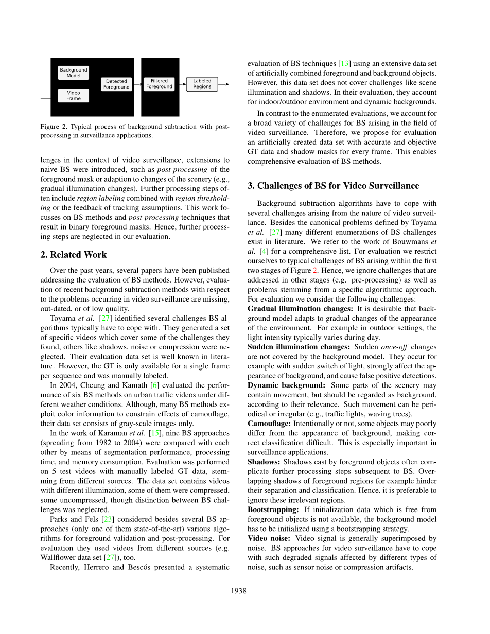 在视频分析中,一种常用的搜索空间缩小和焦点集中建模方法是背景减法(BS)。术语BS涵盖了一组旨在利用背景模型来区分视频序列中的前景和背景区域的方法。在过去的几年中,出现了各种各样的背景减法(参照[24,9,4,2,3]),每种方法都有自己的特点,优势和劣势。评估可以确定这些特征,并有助于关注其余问题。尽管文献很重要,但它缺乏对近期背景减法的综合评估。其中一个原因可能是在生成自然视频序列的高质量地面真实数据(GT)方面做了很大的努力。因此,一些评估只使用了少量标注的框架很容易的就能评判目标的性能。但是,像素级别的评估可以更好地了解该方法的优点和缺点。有几种技术可以克服人工GT注释。除了专家对分割结果的劳动密集型和高度主观的判断之外,已经开发出了不依赖于GT数据[5,10]或自动生成它们[12]的各种方法。不幸的是,这种方法不适用于评估BS在视频监控中遇到的挑战(参见第3节)。为了解决GT数据采集的问题,我们提出使用人造数据。为了解决“合成数据可能不能真实代表全部实际数据”[9]的问题,我们使用了一个典型的视频监控场景,高质量3D模型和有全局照明的现代光线跟踪技术来解决图像合成的真实性。因此,我们能够生成高质量的像素级GT数据,并分别从其他方面评估这些问题。在引入数据集的基础上,我们用后期处理评估了九种BS方法的性能。这包括几种多模态方法,能够处理动态背景。在现有的评估中几乎没有比较过这些方法。此外,我们能够解决最近文献中几乎没有涵盖的问题,如阴影和噪声。图2表明了BS的典型结构,为许多视频监控应用中的后续处理步骤奠定了基础(例如,[14])。如图所示,BS的主要任务是将输入图像与背景模型进行比较。注意,我们没有对输入图像进行任何预处理,例如颜色转换等。该模型描述了场景的背景区域,并且通常通过分布特征(例如颜色信息)来表示。前景检测根据输入帧和背景模型的相似性确定图像的哪些区域属于前景或背景。这种分类的结果是一个二进制前景模型。