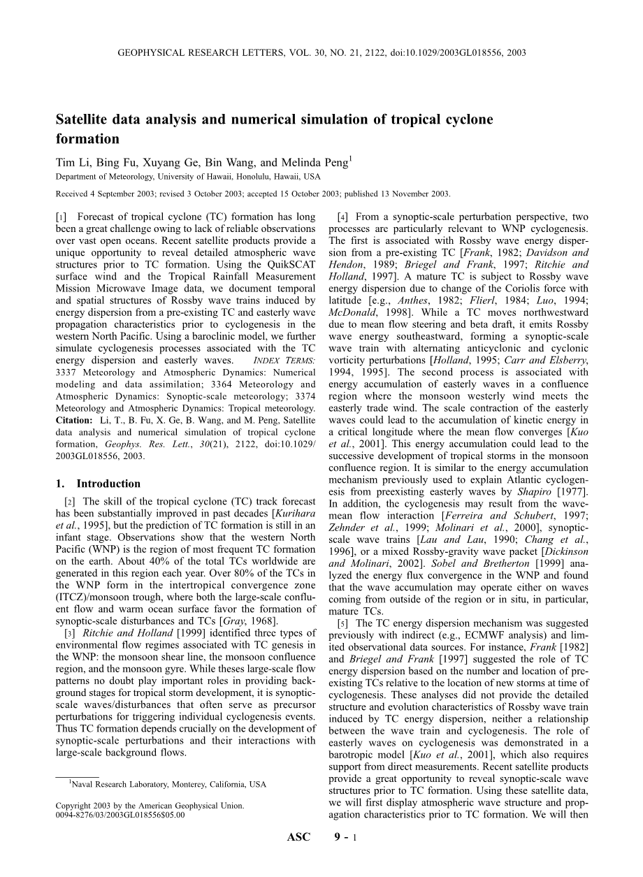 使用从TRMM卫星获得的TMI和QuikSCAT资料,我们已经记录了2000年和2001年与西北太平洋热带气旋形成相关的两个重要的热带气旋过程:来自先前存在的热带气旋的罗斯贝波能量频散和东风波强迫机制。
