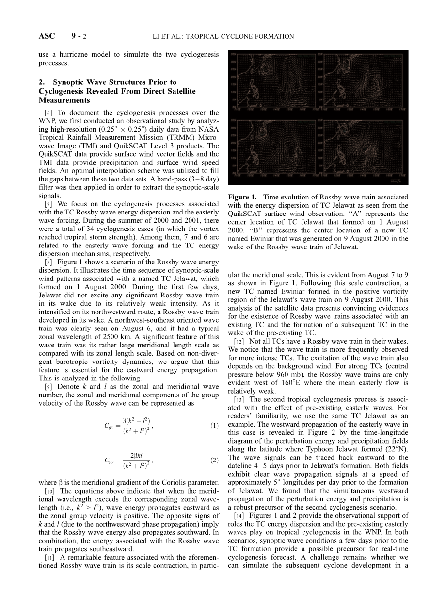 与上述罗斯贝波列相关的一个显著特征是其尺度收缩,特别是经向尺度。如图1所示,从8月7日到9日可以明显的看到这种情况。2000年8月9日,在Jelawat的波列的正涡度区域形成了一个新的热带气旋,名为Ewiniar。对卫星数据的分析为罗斯贝波列的存在提供了令人信服的证据,这些波列与已经存在的热带气旋有关,并在现有的热带气旋之后形成后续的热带气旋。