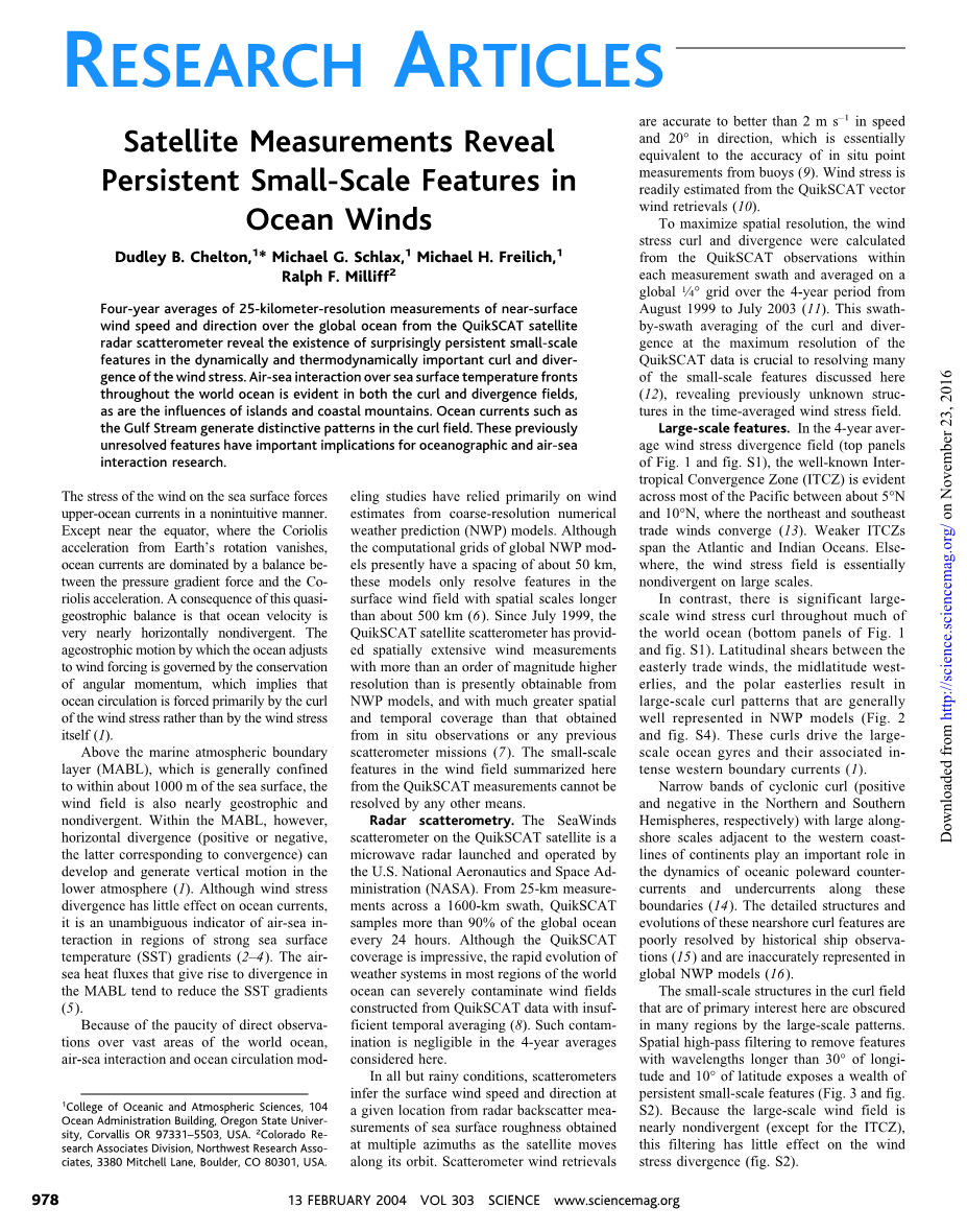 由于缺少对全球范围内广大海域的直接观测,海气相互作用和海洋模拟环流研究主要依赖于粗分辨率的数值天气预报模式(NWP)下的风估计。尽管目前全球NWP模式的数值计算网格大约是50km,这些模型却只能分析海表风场上空间尺度大于500km的特征。从1999年7月开始,QuikSACT卫星散射仪提供了广阔空间上的风测量值,较之NWP模式 现在能得到的数据增加了一个量级的精度,并且比以往所有能得到的观测都有更大的时间和空间覆盖。解决了以其他任何方式都不能解决的我们这里总结的小尺度风场特征。