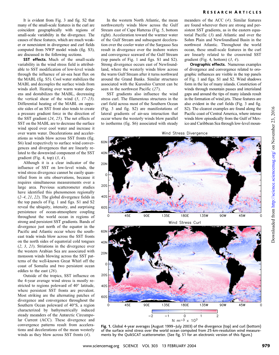 为了最大化空间分辨率,风应力旋度和散度通过1999.8 – 2003.7年4年间宽度平均到全球1frasl;4°网格的卫星数据计算而来。这种许多长条拼起来的最高分辨率旋度散度平均卫星数据对于揭示(12中讨论的)小尺度特征至关重要。揭示了先前未知的时间平均风应力场结构。