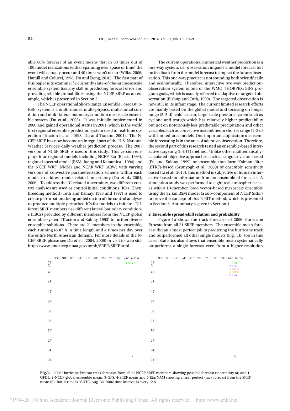图1 2006年飓风Ernesto的路径预报(a)NCEP SREF 21个成员各自的预报路径,表现出了可能的预报不确定性;(b)1-GFDL,2-NCEP全球集合预报,3-GFS,4-SREF平均,5-Eta/NAM各自的预报路径,从图中可看出4-SREF平均预报的预报路径几乎与实际路径重合。起报时间:2006年8月30日06时(世界时);时间间隔:12h
