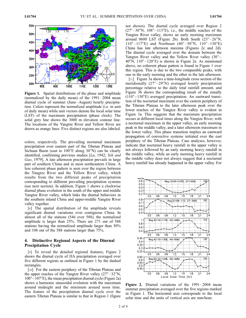 图3b对比了中国南方地区与中国东北地区降水日变化。在南部地区和东北地区,日变化主要是傍晚峰值。但在30°-40°N之间的中东部地区,降水日变化呈现两个峰值,一个在傍晚,另一个清晨,如图2e所示。
