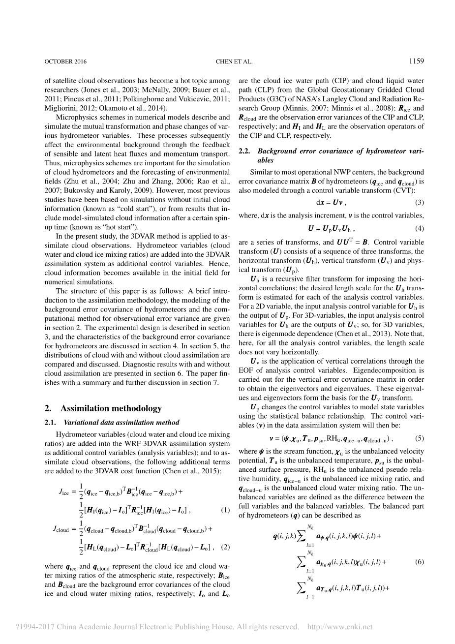 其中qice和qcloud分别代表大气中的云冰和云水混合比;Bice和Bicloud分别是云冰和云水混合比的背景误差协方差;Io和Lo是NASA的兰利云和辐射研究小组的全球地球静止网格云产品(G3C)的云冰路径(CIP)和云水路径(CLP)(Minnis,2007; Minnis等,2008); Rice和Rcloud分别是CIP和CLP的观测误差方差; HI和HL分别是CIP和CLP的观测算子。