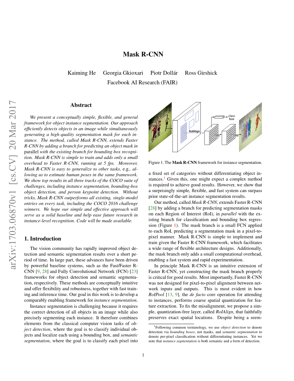 实例分割具有挑战性,因为它要求正确检测图像中的所有对象,同时精确分割每个实例。因此,它结合了来自计算机经典视觉任务的元素。对象检测:目标是分类单个对象,并使用边界框对每个对象进行定位。语义分割:目标是将每个像素划分为无差别对象实例的固定类别。鉴于此目的,人们普遍认为可能需要复杂的方法才能获得良好的结果。然而,我们证明了一个极其简单、灵活和快速的系统可以得到超过现有实例分割技术的结果。