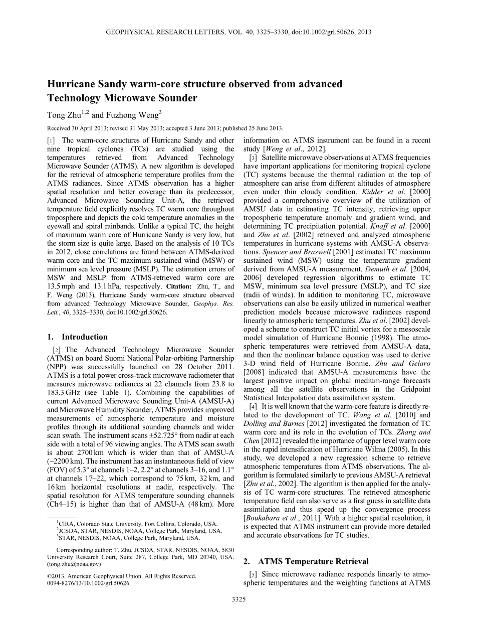 摘要:台风sandy和其他九个热带气旋是通过先进技术微波探测仪(ATMS)所检测到得温度来研究的。从ATMS辐射发展出了一个为反演大气温度廓线检索的算法。由于ATMS观察比它的前身(先进微波探测装置-A)具有更高的空间分辨率和更好的覆盖面,检索到的温度场明确解析穿透整个对流层的台风暖心并描绘了眼墙和螺旋雨带冷距平。不像一个典型的热带气旋,sandy飓风的最大暖心的高度很低,但风暴的尺度相当大。基于对10个2012年的热带气旋分析,ATMS衍生的暖心和热带气旋的最大持续风力(MSW)或最低海平面气压(MSLP)之间找到密切的联系。ATMS反演的暖心最大持续风速和最低海平面气压的估算误差为分别为13.5mph和13.1hPa。