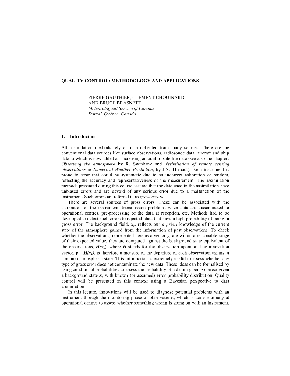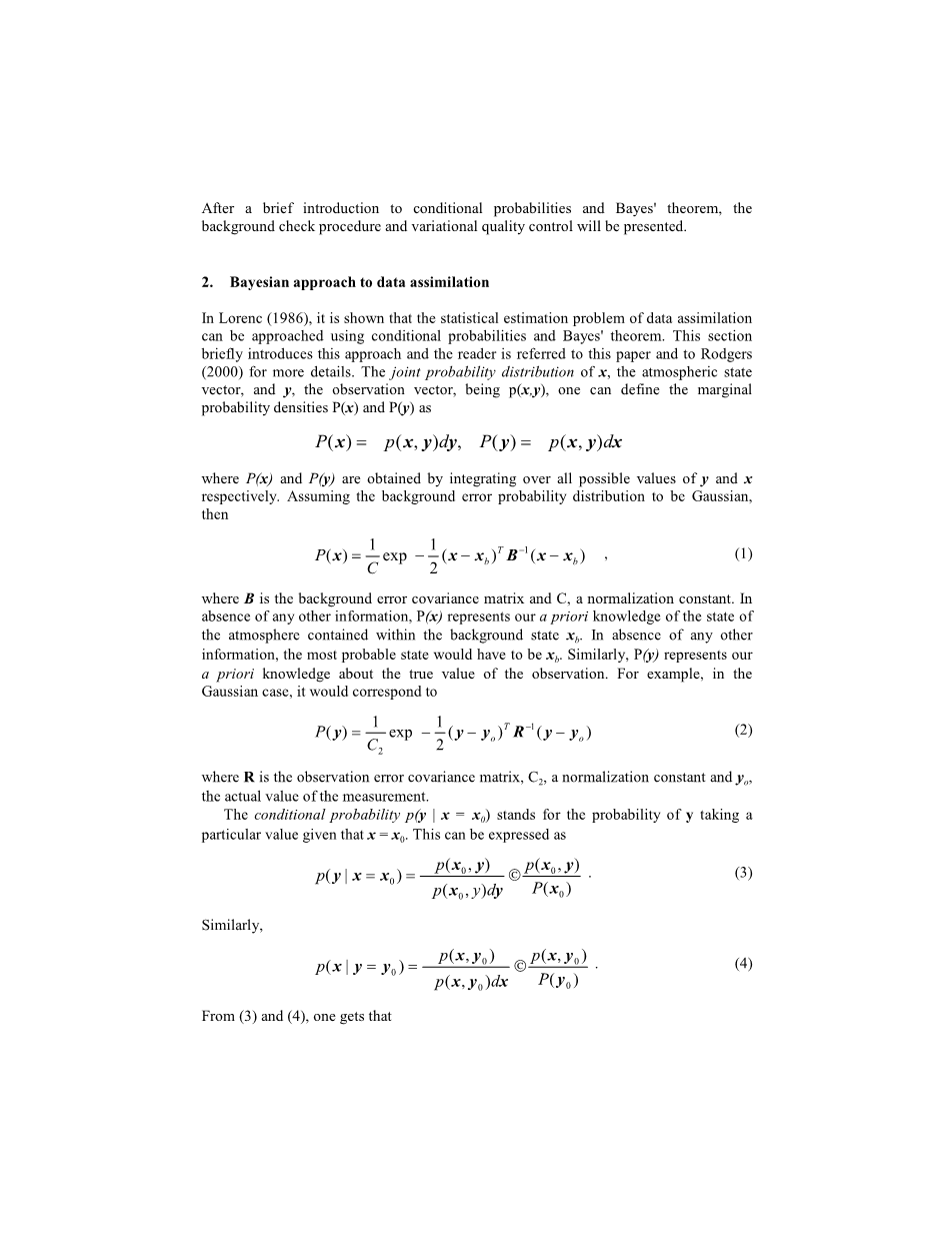 粗差有几个来源。这些可以与仪器校准,数据被传播给运营中心时的传输问题以及接收数据的预处理等相关。必须找出方法以检测出这样的错误,从而剔除所有具有高几率粗差可能的数据。背景场反映了我们从过去的观测场中所获得的先验知识大气当前的状态。我们将这个观测结果表示为矢量y,去检验其是否在期望值内合理变动。他们将与和观测场相当的背景场H()作比较,其中H表示观测算子。更新矢量y- H()则是针对常见的大气状态每个观测量的偏差的量度。这个信息对于评估是否有任意类型的粗差污染了新数据是非常有用的。这些想法可以通过采用条件概率加以形式化,以此评估在给定背景状态与已知的(或假设的)误差概率分布下基准y正确的概率。在本文中,质量控制将使用贝叶斯的角度对数据进行同化。